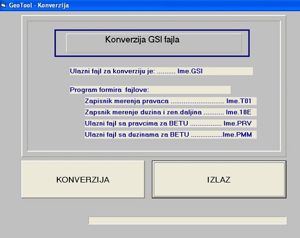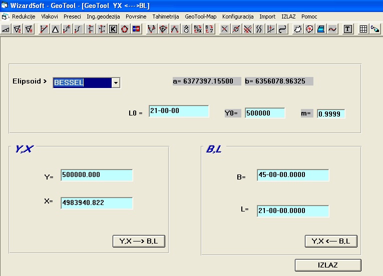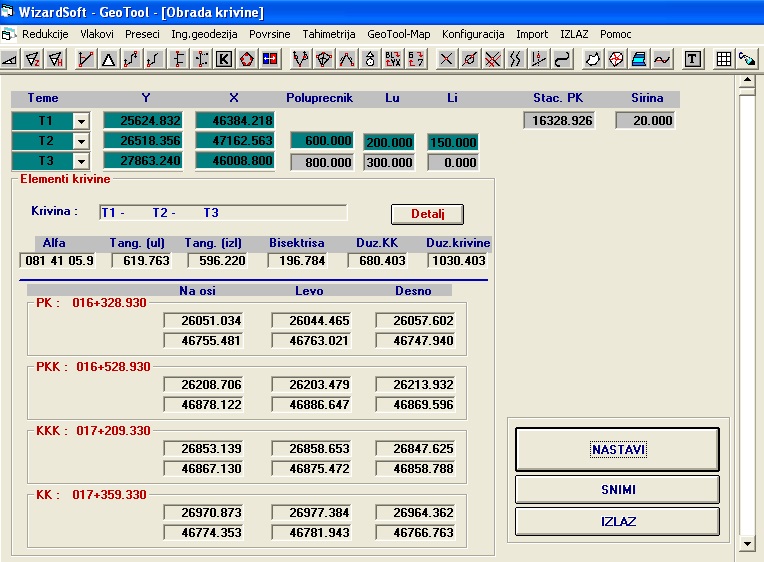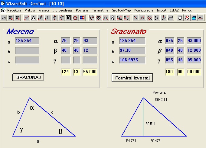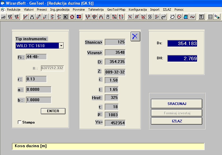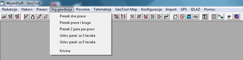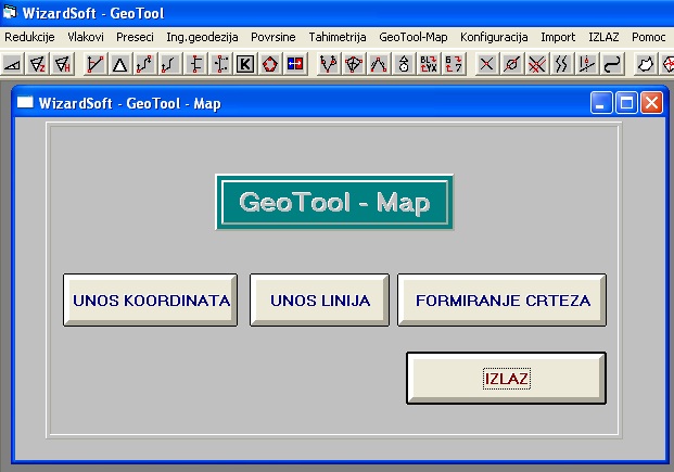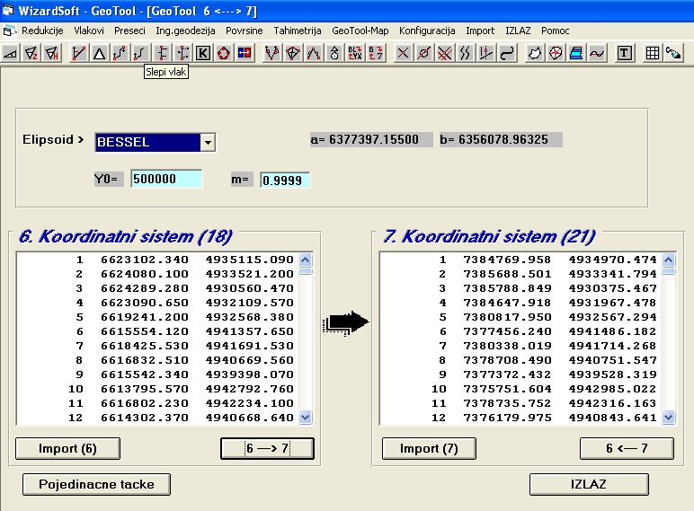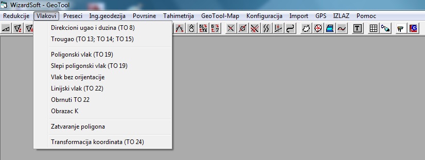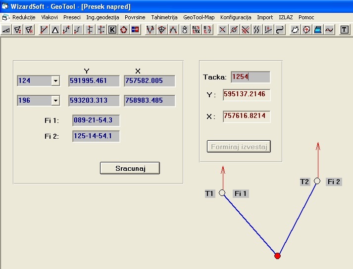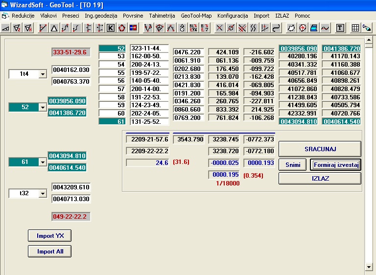 Program WizardSoft GeoTool 2.1 je programski paket za geodetska računanja. Obrada koja se postiže ovim softverom je sledeća: • Redukcija duzina na horizont (TO 18e) • Redukcija duzina na GK/UTM-Z (TO 18e) • Redukcija duzina na GK/UTM-H (TO 18e) • Direkcioni ugao i duzina (TO 8) • Trougao (TO 13; TO 14; TO 15) • Poligonski vlak (TO 19) • Slepi poligonski vlak (TO 19) • Vlak bez orijentacije • Linijski vlak (TO 22) • Obrnuti TO 22 • Obrazac K • Zatvaranje poligona • Transformacija koordinata (TO 24) • Presk napred (TO 10) • Presek nazad (TO 11) • Lucni presek (TO 23) • Izravnanje jedne tacke • F,L <---> Y,X • Deg<--->Dms • 6 <---> 7 • BG<--->DKS • PN<--->NVT2 • Presek dve prave • Presek prave i kruga • Presek 2 para par.pravi • Uslov paral. sa 3 tacaka • Uslov paral. sa 5 tacaka • Krivina • Povrsina iz koordinata • Povrsina iz merenih podataka • Parcelacija • Racunanje zapremine • Unos i obrada tah.zap. • Formiranje tah.zapisnika • Podela na listove • GeoTool - Map • Importovanje podataka iz totalnih stanica (Leica, Sokkia, Topcon) • AGROS 3x30 • GeoTrans – transformacije 3D, 2D. 1D • yx / XYZ <----> BL / BLh Napomena: Sva računanja i izveštaji, odnosno, izlazni fajlovi su urađeni u skladu sa pravilničkom regulativom Republičkog geodetskog zavoda. Cena softvera: Cena jedne instalacije...........400 evra (u dinarima) (neto) Način plaćanja: Na žiro račun autorskog biroa (Preduzeće za zaštitu autorskih prava i inženjering u Beogradu) koji je zastupnik autora.